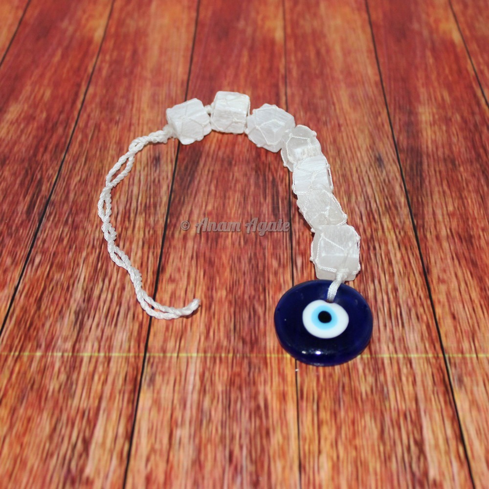 Selenite Cube Shape with Blue Evil Eye Hanger