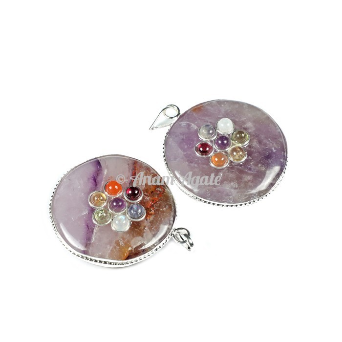 Browse our online collection of Amethsyt Chakra Disc Pendants. The pendant is made from Amethsyt gemstone with silver electroplated band. This charm is hand made and absolutely unique. Wearing this pendant is helpful in purifying the mind and clearing negative thoughts. Amethyst will increase your psychic abilities and enhance you intuition. Amethyst will expand your clairvoyant capacities and upgrade you instinct. It is also useful in decontaminating the brain and clearing negative thoughts. For any unique request or change of configuration get in touch with us directly.