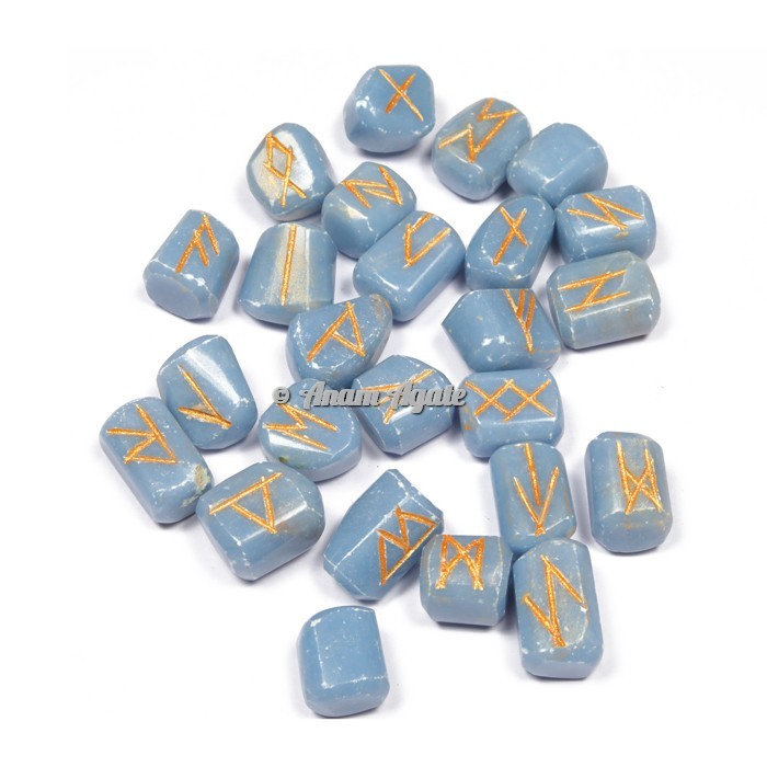 Exclusive collection of Angelite Rune Set at lowest price. Angelite helps connect with the angelic realm and is very good to use during meditation. It brings peace and compassion when worn or carried. It enables one to easily forgive and let go of negative and angry emotions easily. It is one of the most soothing and calming stones. Runes are the letters in a set of related alphabets known as runic alphabets, which were used to write various Germanic languages before the adoption of the Latin alphabet and for specialised purposes thereafter. Order online now.