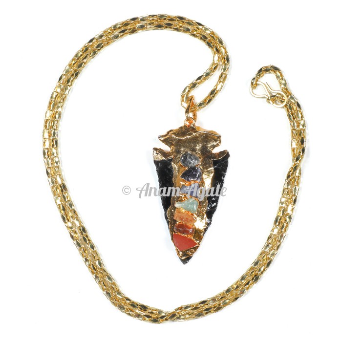 Here is the attractive collection of Black Obsidian Chakra Arrowheads Gold Electro Pendants at cheapest price.This stunning pendant is made from Obsidian crystal stone with golden electroplated 7 chakra gemstones.Black Obsidian Stone is a powerful cleanser of psychic smog created within your aura, and is a strong psychic protection stone. This stone has powerful metaphysical properties that will help to shield you against negativity.