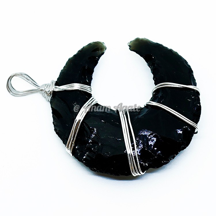 Get Black Obsidian Moon Wire Wrapped Healing Pendant A online from Anam Agate at low price. Black Obsidian Stone is a powerful cleanser of psychic smog created within your aura, and is a strong psychic protection stone. This stone has powerful metaphysical properties that will help to shield you against negativity. The energy of these stones may stimulate the gift of prophesy and may boost precognition. A strongly protective stone, it forms a shield against negativity. It blocks psychic attack and absorbs negative energies from the environment. Obsidian draws out mental stress and tension. Obsidian dissolves emotional blockages and ancient traumas. Pendant, in jewelry, ornament suspended from a bracelet, earring, or, especially, a necklace. Pendants are derived from the primitive practice of wearing amulets or talismans around the neck. The practice dates from the Stone Age, when pendants consisted of such objects as teeth, stones, and shells. A gemstone worn as a pendant always gives better result than a ring.