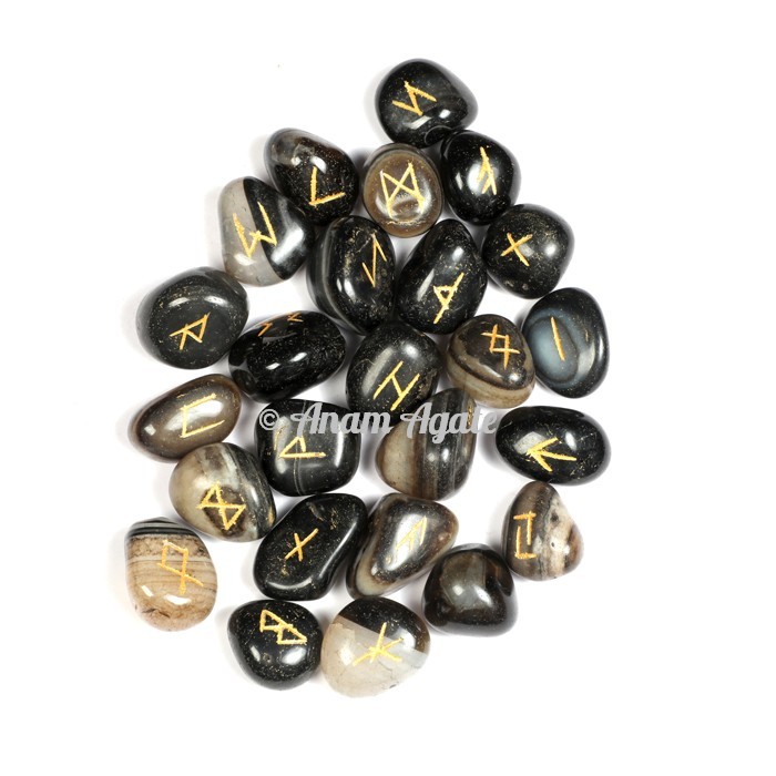 Black Onyx Rune Set is a glossy dark gemstone usually associated with the Root Chakra. It is a stabilizing, balancing stone said to assist with mastery of the body`s energy. Black Onyx can strengthen determination and willpower, and help bring wisdom in difficult circumstances. It may be used for divination, magick, and meditation. Order online now.