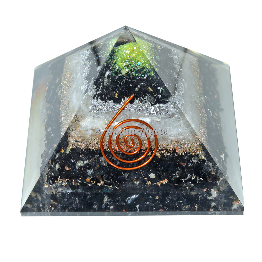 Here is a huge range of Black Tourmaline With Selenite Orgonite Pyramid online at low price. Black Tourmaline is probably ?the` stone when dealing with negative energy. Not only does black tourmaline help get rid of negative energy, it also work on attracting positive energy. Black tourmaline has other interesting qualities that truly makes it a mysterious gemstone. Black Tourmaline also aids in the removal of negative energies within a person or a space. Black Tourmaline will cleanse, purify, and transform dense energy into a lighter vibration. A popular metaphysical stone, Black Tourmaline is also great for grounding. It balances, harmonizes, and protects all of the Chakras. Selenite, also known as satin spar, desert rose, or gypsum flower are four crystal structure varieties of the mineral gypsum. These four varieties of gypsum may be grouped together and called selenite. Orgone pyramid helps to neutralize electronic smog (EMF) from cell phones, cell phone towers, wi-fi, computers and electronic devices that you expose yourself to on a daily basis. The interaction of organic resin and inorganic metal creates orgone.