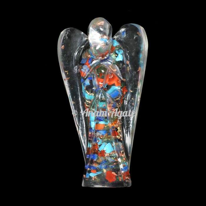 A beautiful and extremely powerful Chakra Orgone Angels with 7 different gemstone chips embedded in the orgonite resin matrix. Chakra Stones are perfect to use in balancing your energy and focusing on specific areas of the mind, body and spirit.This handmade angel is a beautiful gift for anyone who wants the blessings of unconditional love and heart healing.