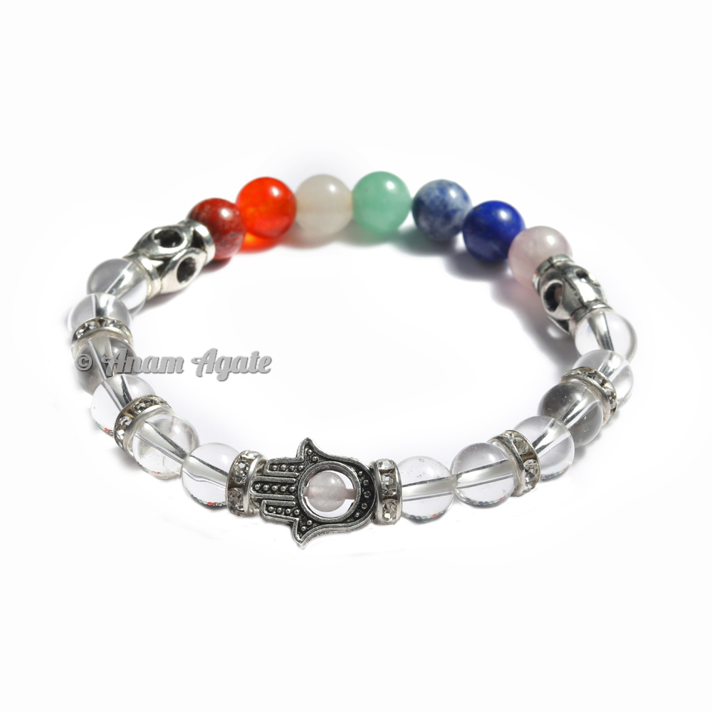 Get Crystal Quartz Hamsa Evil Eye Chakra Bracelets today at low price from Anam Agate. Quartz can balance and revitalize the physical, mental, emotional and spiritual planes. Cleanse and enhance the organs and subtle bodies. When 7 Chakra Bracelets are worn, it helps to keep the seven Chakras at their right energy levels causing the wearer to feel more balanced. The task becomes attainable as it helps to focus on keeping the chakras open and replace negative thoughts with an optimistic outlook towards life. It is a curse or legend believed to be cast by this malevolent glare, and usually given to a person when they are unaware. An evil eye is a talisman or amulet, designed in the shape of an eye, traditionally in the colors blue or green, that indicate spiritual protection. The Hamsa Hand is a sign of protection, thought to bring happiness, luck, good health and fortune. It`s also used to ward off what is often known as ?the evil eye??the cross-religious belief in a cursed stare whose destructive energies encapsulate all the negative energies in the world.