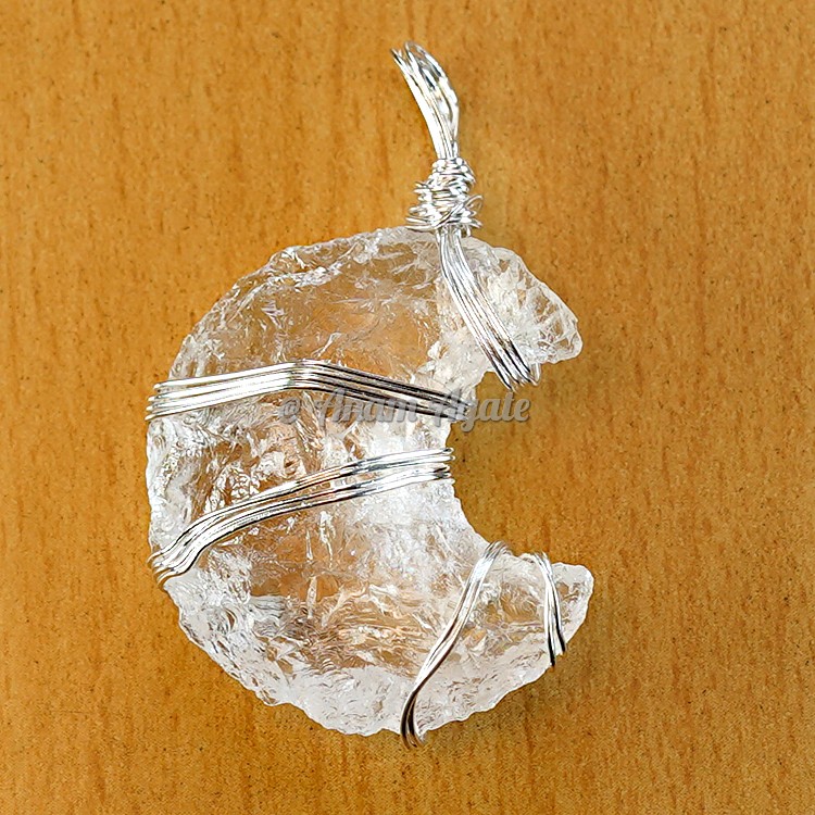 Best collection of Crystal Quartz Moon Wire Wrapped Healing Pendant A is here at Anam Agate. Today Quartz Crystal is used as a crystal oscillator with the Quartz clock being a familiar example of a device using these properties. It is also employed in many modern technologies to make things like silicon chips for computers, radios and various other man-made devices. Quartz is more valuable when it is completely intact; however, a piece of naturally occurring quartz of unusual color is still worth more and of higher quality than a smooth piece of manufactured plastic or glass designed to imitate quartz. Pendant, in jewelry, ornament suspended from a bracelet, earring, or, especially, a necklace. Pendants are derived from the primitive practice of wearing amulets or talismans around the neck. The practice dates from the Stone Age, when pendants consisted of such objects as teeth, stones, and shells. A gemstone worn as a pendant always gives better result than a ring. Place an order now at Anam Agate.