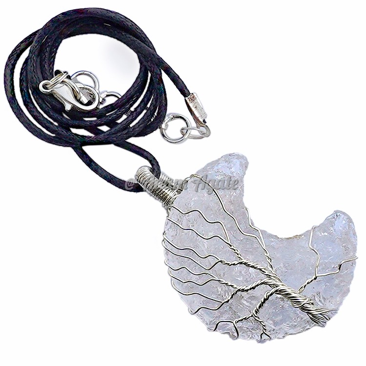 Shop for Crystal Quartz Moon Wrapped Pendants Online from Anam Agate today. Today Quartz Crystal is used as a crystal oscillator with the Quartz clock being a familiar example of a device using these properties. It is also employed in many modern technologies to make things like silicon chips for computers, radios and various other man-made devices. Quartz is more valuable when it is completely intact; however, a piece of naturally occurring quartz of unusual color is still worth more and of higher quality than a smooth piece of manufactured plastic or glass designed to imitate quartz. Pendant, in jewelry, ornament suspended from a bracelet, earring, or, especially, a necklace. Pendants are derived from the primitive practice of wearing amulets or talismans around the neck. The practice dates from the Stone Age, when pendants consisted of such objects as teeth, stones, and shells. A gemstone worn as a pendant always gives better result than a ring. Place an order now at Anam Agate.
