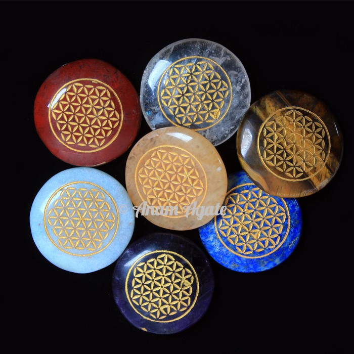 The set features 7 beautifully engraved discs, each stone representing one chakra: