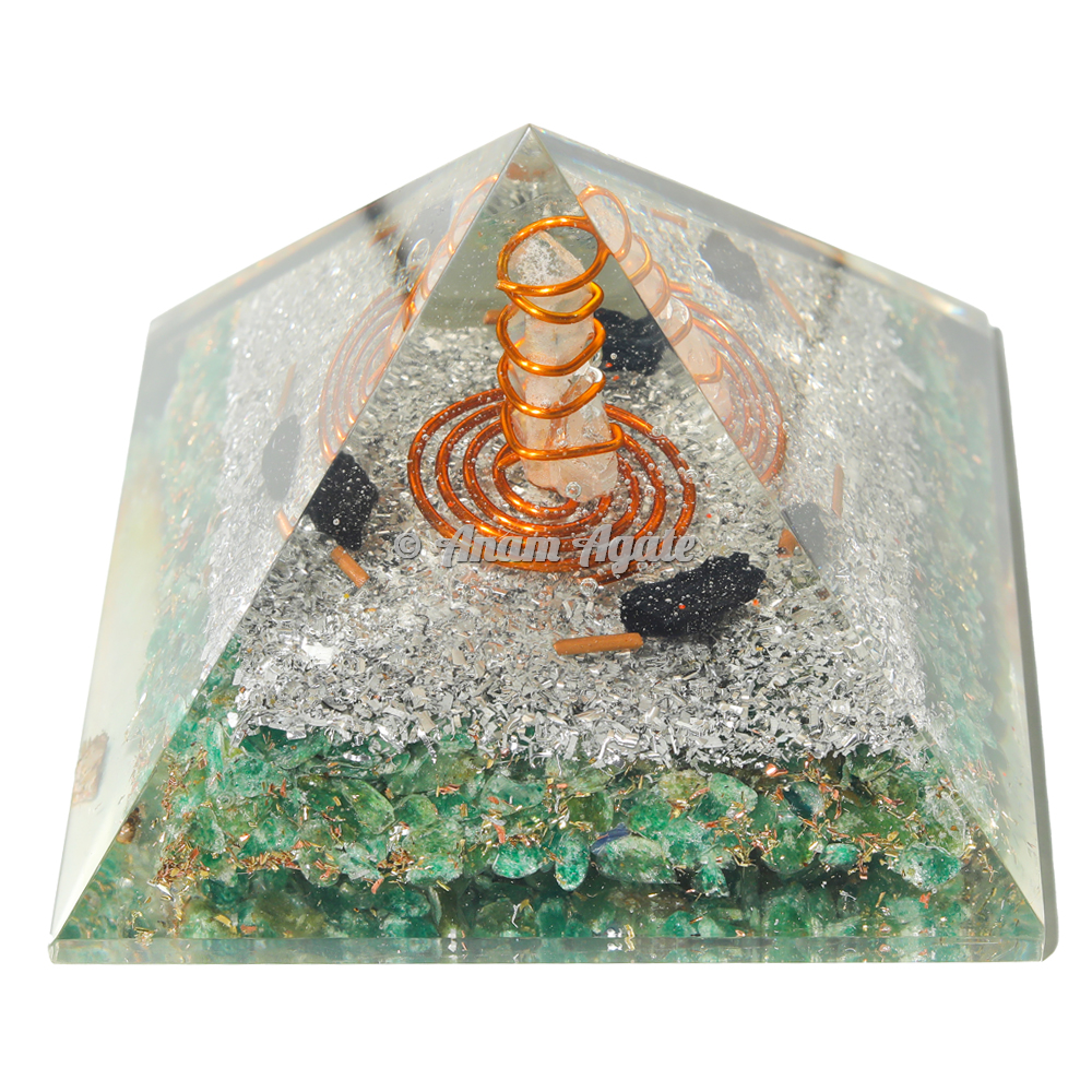 Order online for Green Jade Orgonite Pyramid today at Anam Agate. Green Jade is a comforter and heart healer, used to clear and activate the Heart Chakra for general well-being and emotional calm. It is also a powerful protector of the Heart Chakra, providing a shield to block entry from those who would and use the energy of another. Green Jade comforts, harmonizes, protects the heart, and can help attract love later in life. It is one of the premier stones to attract luck, abundance and success. Green Jade has a particularly soothing energy behind it, and is recommended for working through unresolved emotional issues. Orgonite pyramid helps to filter and balance energy fields in our environment and can aid in strengthening your energy body by converting low frequency energy into a higher frequency that is more beneficial for life forms including yourself, pets and plants. Orgone pyramids are made of a mix of organic (resin) and non-organic materials (metal shavings) that have the property of moving the orgone energy back and forth and act as a cleansing of the stagnant, negative energies.
