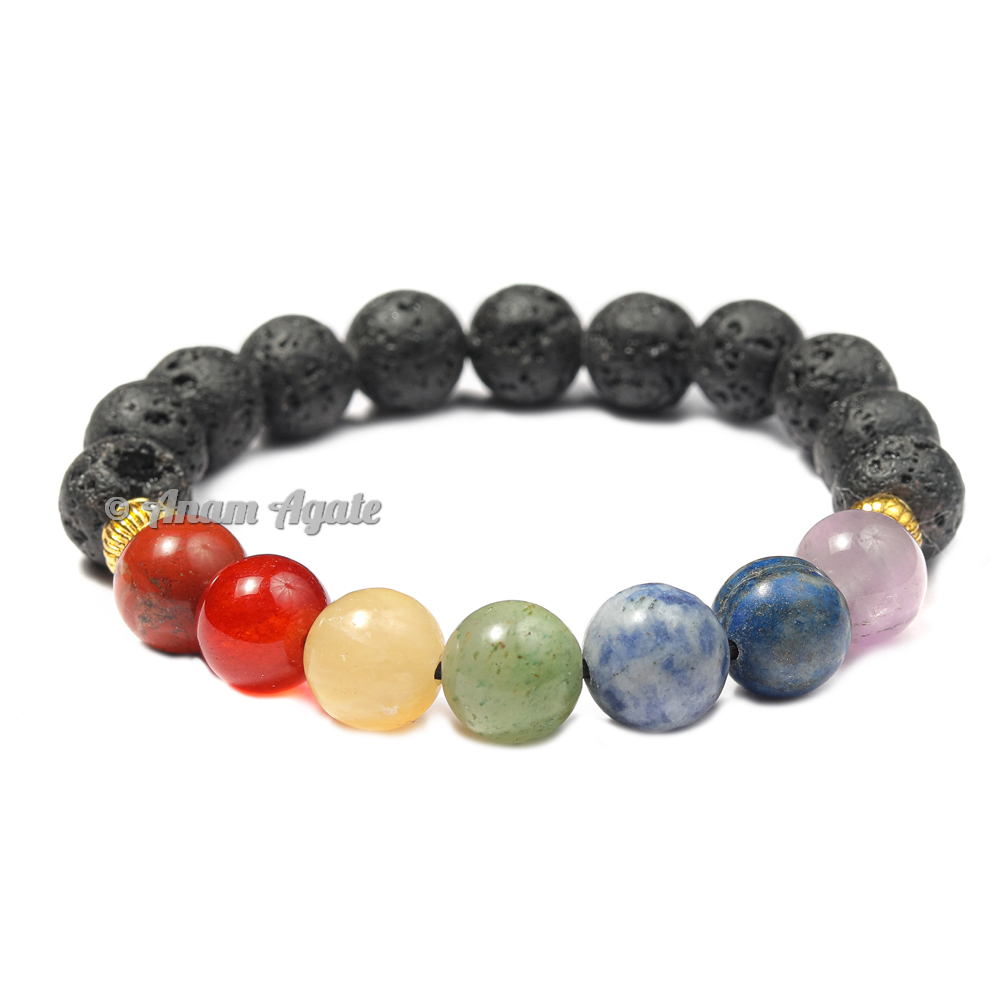 Unique collection of Lava Stones Chakra Bracelets is availale here at Anam Agate. Lava stones aren`t anything new. Lava stones are formed when volcanoes erupt, much like obsidian stones. The lava shoots out of a volcano and runs down its side. Once this incredibly hot liquid rock dries, it becomes a lava stone. Because of these processes, lava stone is considered to be a stone of rebirth. Lava Stone is a grounding stone that strengthens one`s connection to Mother Earth. It gives us strength and courage, allowing us stability through times of change. It provides guidance and understanding in situations where we may need to "bounce back". A calming stone, it is very useful in dissipating anger. When 7 Chakra Bracelets are worn, it helps to keep the seven Chakras at their right energy levels causing the wearer to feel more balanced. The task becomes attainable as it helps to focus on keeping the chakras open and replace negative thoughts with an optimistic outlook towards life.