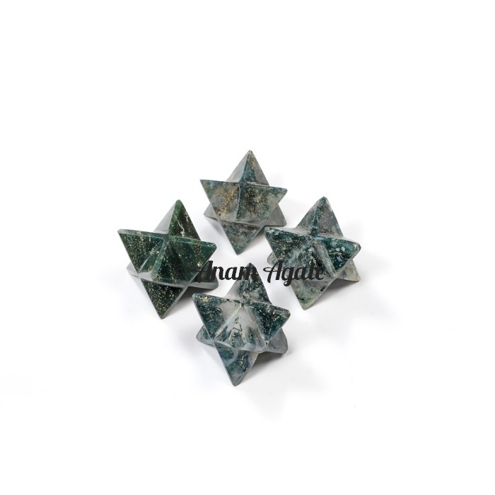 Exclusive collection of Moss Agate Merkaba Star at lowest price.It is associated with nature spirits, bringing Earth energy into its healing.It helps to release old habits and promote forgiveness.It also attracts wealth and abundance, improves self-esteem, and helps to calm and release fears.Moss Agate also comforts and soothes emotional wounds.Use this star to balance the Heart Chakra when releasing stress.