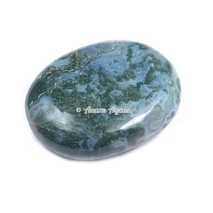Get Moss Agate Palm Stone at Anam Agate from India. Moss Agate is a stone of new beginnings. Refreshes the soul and enables you to see beauty in all you behold. Moss Agate reduces sensitivity to weather and environmental pollutants. It attracts abundance in wealth and improves self-esteem. The vibration of this stone brings you strength and courage, and will help to lessen fear and stress and may aid you to attract nature spirits. Order now.