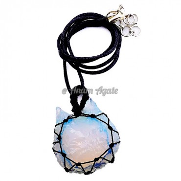 The best deal on Opalite Kitty Macrame Wrapped Pendants is available now at Anam Agate. Opalite improves communication on all levels, especially the spiritual. It removes energy blockages of the chakras and meridians. Emotionally, Opalite helps by assisting during transitions of all kinds. It engenders persistence and gives us strength in verbalising our hidden feelings. The Pendant Setting is a popular Macrame technique used to wrap the edges of cabochons, flat stones, or coins. It features the decorative knot called the Vertical Larks Head, along with crossed elements. Pendant, in jewelry, ornament suspended from a bracelet, earring, or, especially, a necklace. Pendants are derived from the primitive practice of wearing amulets or talismans around the neck. The practice dates from the Stone Age, when pendants consisted of such objects as teeth, stones, and shells. A gemstone worn as a pendant always gives better result than a ring.