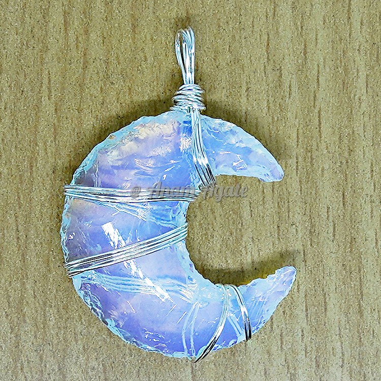 A huge range of Opalite Moon Wire Wrapped Pendant B is here only at Anam Agate. Opalite is a beautiful, sky blue stone that symbolizes clear thinking, new beginnings, and childlike glee. Unlike many other crystals, Opalite is a man-made stone created from glass. As such, it has a far different meaning for spiritual purposes compared to other, natural stones coming from the Earth. Opalite improves communication on all levels, especially the spiritual. It removes energy blockages of the chakras and meridians. Emotionally, Opalite helps by assisting during transitions of all kinds. It engenders persistence and gives us strength in verbalising our hidden feelings. Pendant, in jewelry, ornament suspended from a bracelet, earring, or, especially, a necklace. Pendants are derived from the primitive practice of wearing amulets or talismans around the neck. The practice dates from the Stone Age, when pendants consisted of such objects as teeth, stones, and shells. A gemstone worn as a pendant always gives better result than a ring.