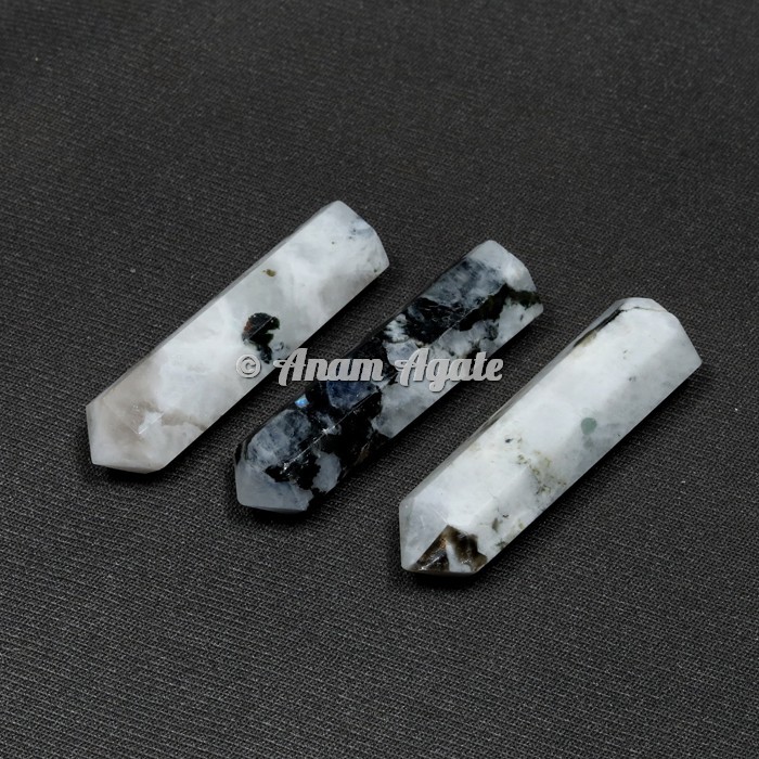 Get the best deal on Rainbow Moonstone Pencil Points at Anam Agate. Rainbow moonstone is thought to bring balance, harmony and hope while enhancing creativity, compassion, endurance and inner confidence. Rainbow moonstone is believed to help strengthen intuition and psychic perception, especially offering us visions of things that aren`t immediately obvious. Rainbow Moonstone`s energies activate and align all our chakras to allow energy to flow freely. It`s a very soothing stone with outputting vibrations full of calming and relaxing energy. This powerful crystal connects with one`s emotional body and current mental state. Because of its connection to the moon, this stone rocks at soothing emotions during that time of the month. The Moonstone crystal healing properties are the best stones for balancing hormones and providing support during periods of hormonal change such as puberty or menopause.