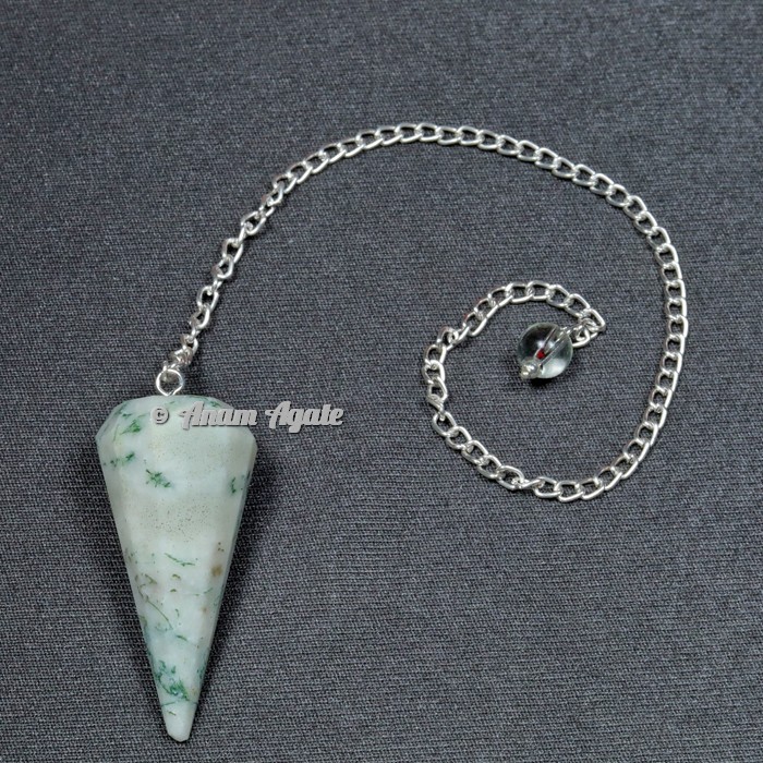 Get the best Tree Agate 6 Faceted Pendulums at Wholesale price only at Anam Agate. Tree Agate Pendulum helps to clear energy blockages in the Nadis (energy channels) to allow for a greater flow of this energy throughout the body. It is a highly supportive stone that boosts the immune system and regulates the balance of water in the body. Pendulums are often used as tools for spiritual healing and inner growth. Pendulum will swing back and forth or in a circular motion. A pendulum works by converting energy back and forth, a bit like a rollercoaster ride. It repeatedly switches its energy back and forth between potential and kinetic. Place the order today.