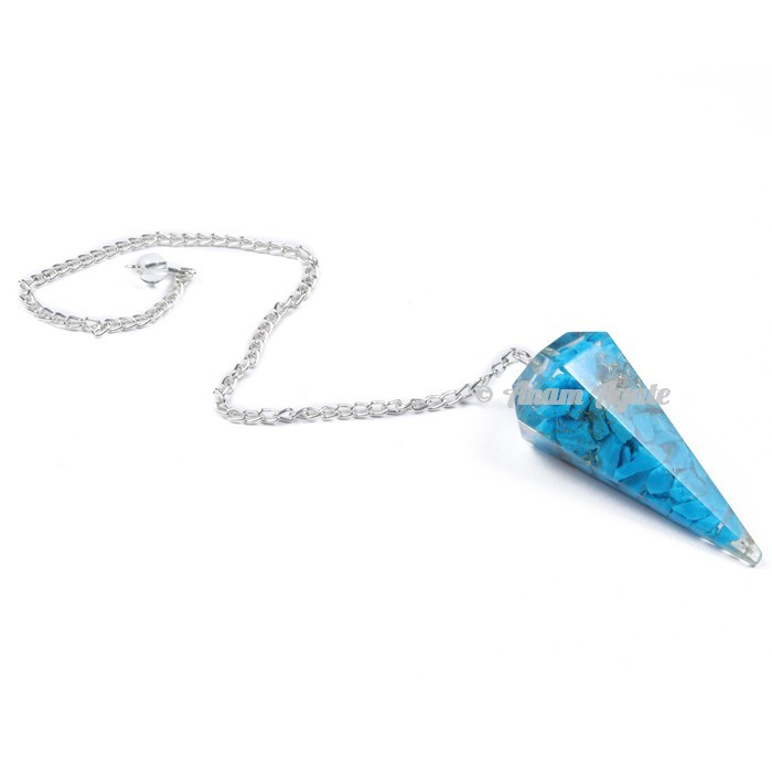 Exclusive collection of Turquoise 6 Faceted Orgone Pendulum. This Orgone Pendulum have been known throughout history for their beauty and healing qualities. Many people believe that each stone emits energy that affect our well-being. Turquoise promotes self-realisation and assists creative problem solving. It purifies lungs, soothes and clears sore throats, and helps to heal any ailment of the eyes. It dispels negative energy and can be worn to protect against outside influences, it has long been worn as a protective talisman by kings and laymen alike. This amazing Orgone Pendulum is available in wholesale price only at Anam Agate.